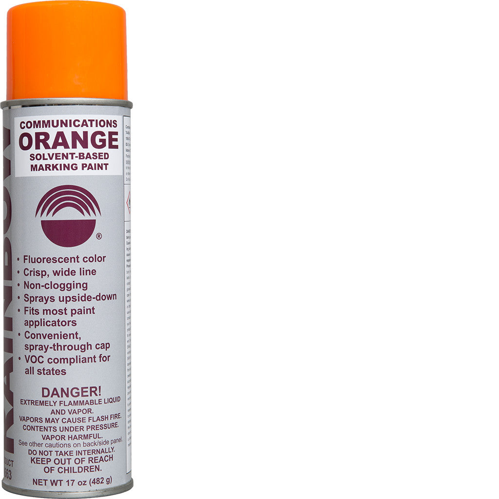These 20 ounce aerosol cans are excellent for use in marking construction areas, landscape design, excavation sites, traffic safety, athletic sites, survey crews, utility line, buried cables, and much more. May be used on asphalt, concrete, gravel, dirt, and grass. Unique upside-down spray system for application versatility. High solids formula produces a highly visible coating. Lead-free, VOC compliant formula. Coating lasts approximately 30-90 days, depending on environmental conditions. Available in all APWA colors - please inquire.