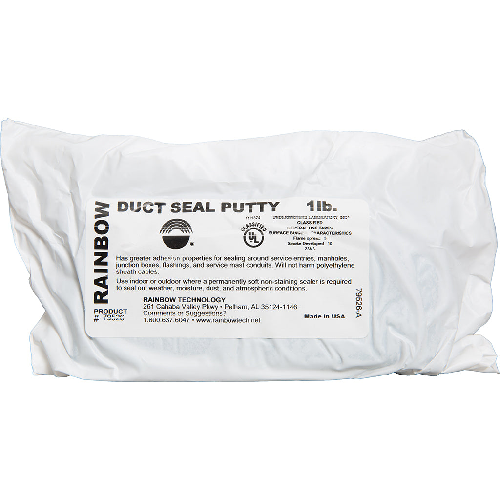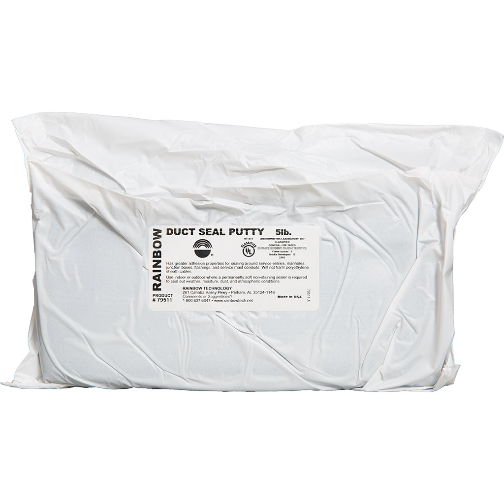 Rainbow Duct Seal Putty is used primarily by the building industry, and specifically by the electrical trade, to seal around electrical boxes, flashings, service mast entries, and more. It can be shaped by hand to any form and reused if necessary.